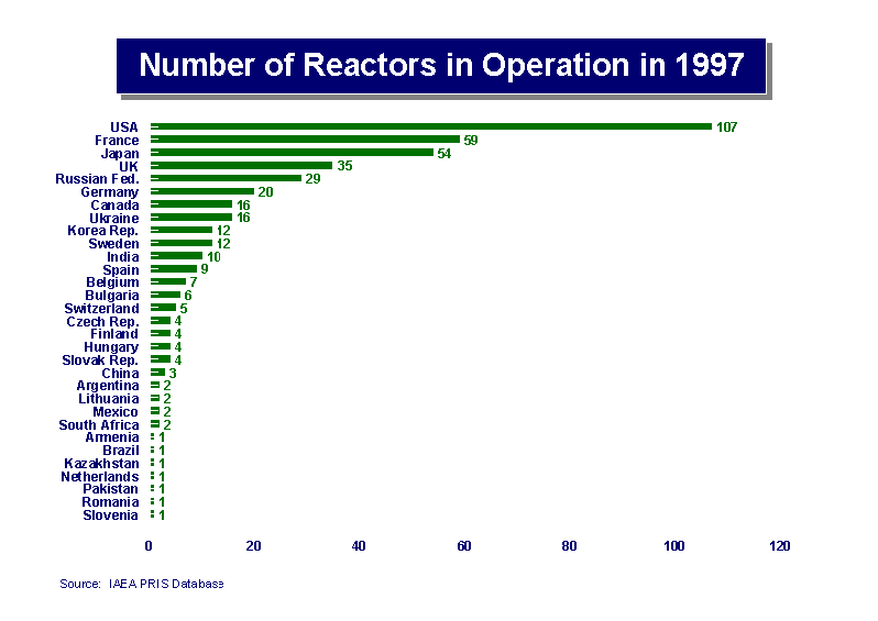 of the former Soviet Union and nations in eastern Europe are not included because they have been addressed separately in an earlier paper(Horak, Purvis, September, 1998) . The figure below shows the nations considered and the number of reactors in operation at the end of 1997. There were 425 nuclear power plants in operation in thirty-one nations. The identified countries where significant concerns exist are: India China Argentina South Africa Brazil Pakistan India’s grid has numerous problems and continues to need to be upgraded and modernized to handle routine demands. Problems with transfers between States and “load losses” exacerbate difficulties with transmission and dispatch. Pakistan may also have major problems. It has an electrical system with technical problems, coupled with internal economic problems. China’s problems are complicated due to China’s large size, the age of some parts of the electric power system, the large demand, and the number of interconnections with adjacent nations. It is not apparent if China could be best addressed as a region that includes some adjacent countries, or as several regions. In any event, there will be numerous interconnections that require consideration. South Africa should be able to mitigate problems with timely action, however, due to interconnections with systems not under South African control, maintaining grid stability may require it to trip from all interconnections, including some that are internal. While this may alleviate the problems in South Africa, it will increase problems in adjacent nations. This appears to be most appropriately considered as a regional problem. The problem is that due to local geographical factors the region may be most of Sub Saharan Africa, and not just nations near South Africa. Argentina and Brazil should be able to mitigate problems with timely action. No information was found, however indicating that such action is under way. This should be considered as a regional problem. Due to Mexico’s proximity to, and interconnections with, NERC Regions some actions are apparently being taken. Concerns with Mexico’s ability to cope with this problem could not be eliminated due to regional factors. There was not sufficient information available to make a judgment concerning Spain, so further review is required. In addition, due to strong interfaces with Russia, Finland and Sweden may not be able to avoid grid stability problems.