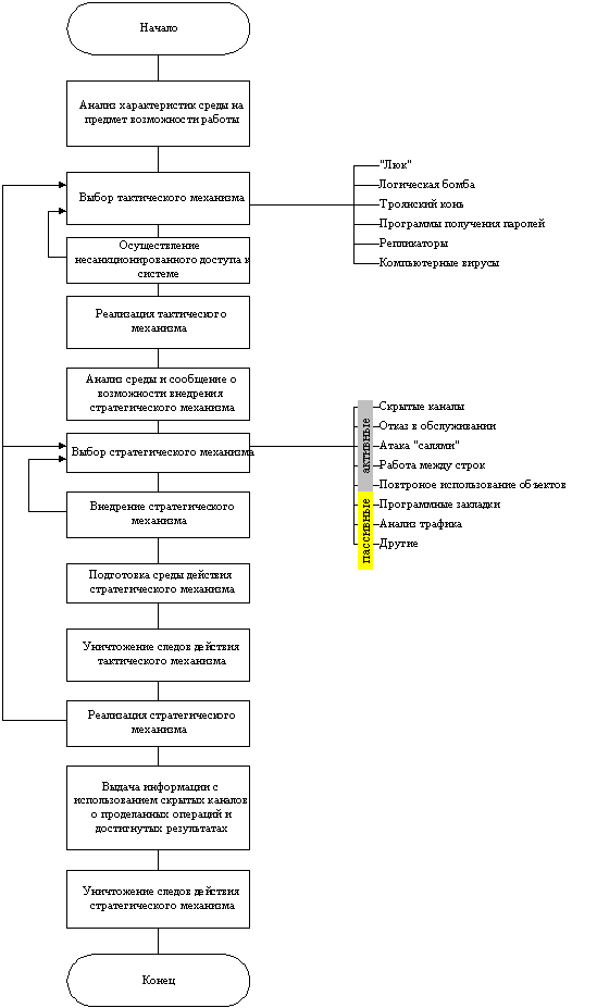 Рассматривается ППЗ, которое реализует тактический механизм для достижения тактической цели и после этого реализует стратегический механизм для достижения стратегической цели. После запуска полиморфное программное злоупотребление должно проводить анализ характеристик среды на предмет возможности реализации своих механизмов. Анализ проводится по двум направлениям. Первое направление - это анализ аппаратной части для определения платформы (персональные ЭВМ - Intel, Macintosh; рабочие станции - Sun, DEC и др.). Второе направление ориентировано на определение операционной системы и рабочей среды, используемой на каждом конкретном компьютере, информация о которой будет служить основой для определения возможного типа атаки. После анализа среды, на основе полученной информации выбирается тактический механизм, используемый для получения доступа и реализуется попытка получения несанкционированного доступа к информационной системе. Следует отметить, что данный процесс является многоитерационным и может повторятся до тех пор, пока не будет получен доступ к ЭИС. После получения доступа к системе реализуется дополнительный тактический механизм, если таковой предусмотрен. Дополнительный тактический механизм реализует основные функции по внедрению и запуску стратегического механизма, а именно: дополнительно анализируется среда и посылается злоумышленнику сообщение о возможности внедрения стратегического механизма. В зависимости от целевой функции и конкретной аппаратной и программной среды производится выбор стратегического механизма. При этом могут быть выбраны пассивные и/или активные механизмы. Следующим этапом является внедрение стратегического механизма, целью которого является реализация основной функции программного злоупотребления. В случае, если внедрение стратегического механизма произошло со сбоями, реализуется возврат на один шаг назад и производится попытка выбора другого стратегического механизма. В случае, когда внедрение стратегического механизма произошло нормально, тактический механизм реализует подготовку среды действия стратегического механизма, после чего уничтожается следы действия тактического механизма во избежание раскрытия программного злоупотребления стандартными методами. Рассмотренные ранее этапы реализации ППЗ - предварительные. Основным этапом в реализации полиморфного программного злоупотребления является реализация стратегического механизма, призванного достичь основной цели программного злоупотребления. Если реализация этого механизма не проходит нормально, то происходит возврат на этап выбора стратегического механизма или на этап выбора и реализации тактического механизма (для случая, когда требуется получить доступ к другому компьютеру, сети, системе). При успешной реализации рассматриваемого механизма может выполняться выдача нарушителю информации о проделанных операциях и достигнутых результатах. В качестве путей передачи информации нарушителю могут использоваться “скрытые каналы”. Последним этапом реализации ППЗ является уничтожение следов действия стратегического механизма в информационной системе. Анализируя опубликованные в литературе сведения о случаях реализации программных злоупотреблений, следует отметить, что первым программным злоуп