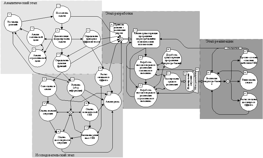 Исследование конфликта требует решение большого количества вопросов, поскольку каждая сторона владеет только своими описаниями и решает конфликт для себя. Для этого должны проводиться системные исследования относительно решения конфликта за каждую сторону и приниматься решения о достижении возможных целей каждой стороной в складывающейся ситуации. Интересным является подход В.И. Ярочкина в [3], где представлен сценарий действий нарушителя. При этом выделяются три основных этапа при реализации нарушения: - информационно-разведывательный этап - сбор необходимой информации об объекте управления и АИС; - подготовительный этап - создание условий для реализации замысла; - реализация замысла. Представляется возможным развить представленный подход и выделить в рамках конфликтов следующие основные циклы:
