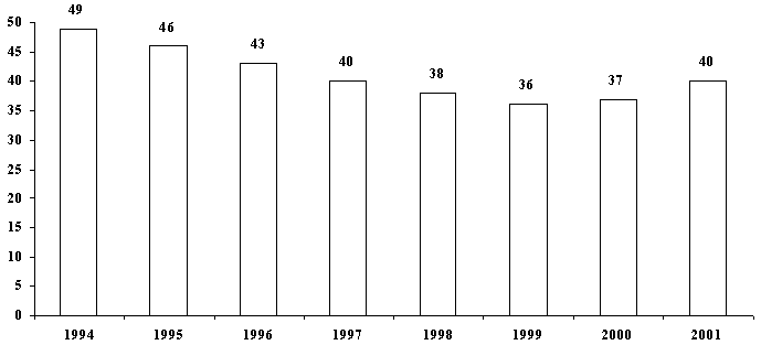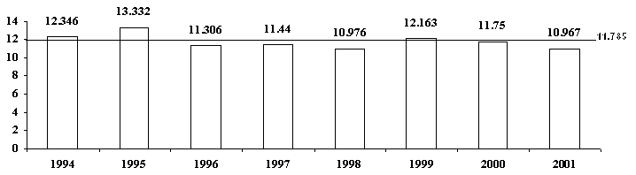 Ещё более показательна в этом смысле динамика теневого рынка, выраженная в абсолютных единицах (миллиардах долларов США). Если внимательно с ней ознакомиться, становится очевидным, что за все годы (с 1994 по 2001) объёмы продаж на теневом рынке кардинально не менялись, незначительно отклоняясь от средней цифры 11,785 миллиардов. В этом контексте нисходящая динамика доли "пиратского" рынка, зарегистрированная в период с 1994 по 1999 год, объясняется активным ростом рынка ПО в указанные годы. Аналогично, рост доли теневого рынка ПО в период с 1999 по 2001 год обусловлен влиянием общемирового экономического кризиса, приведшем к сокращению рынка ПО. Т.е. теневой рынок ПО, фактически, никак не отреагировал на все "антипиратские" меры, применяемые до настоящего времени (Рис. 2.).
