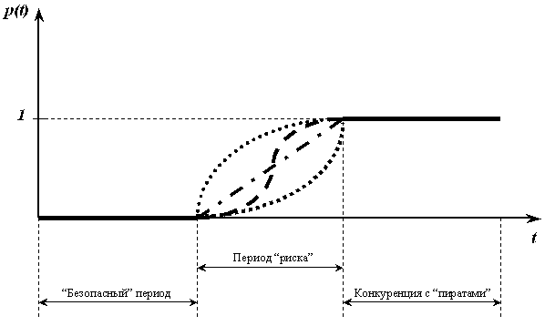 | б) | Период "рискованной торговли" - есть отличная от нуля вероятность того, что "пираты" начали реализацию контрафактных экземпляров ППр; |